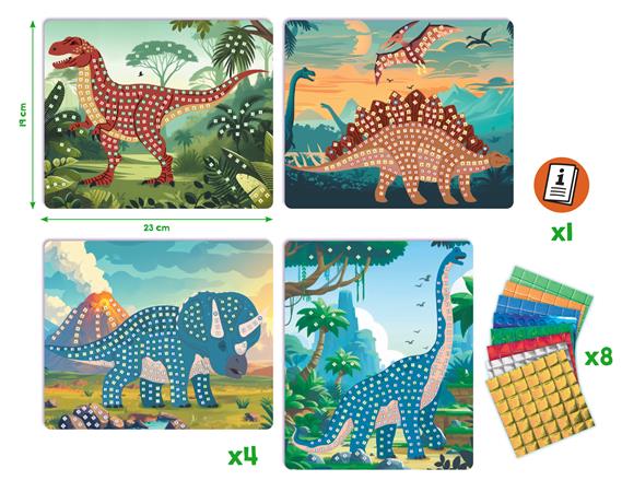 4 dinoszaurusz mintájú kártya, amelyet öntapadó mozaikokkal lehet díszíteni. Ragaszd az öntapadó mozaikokat a képekre, hogy életre keltsd a dinoszauruszokat. Praktikus készlet, amelyhez nincs szükség ragasztóra! A mozaikok könnyen felragaszthatók és tökéletesen alkalmasak a kis kezek számára.
